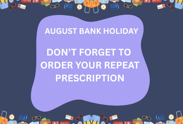 Remember to check you have enough medication to cover you for the upcoming Bank Holiday on Monday 25th August. Your practice will be closed on this date.